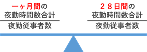 単純には、月平均夜勤時間数は看護職員が計算対象となる病棟で勤務した夜勤時間数の計算期間での合計数を、その病棟でその期間内において夜勤に従事した者の合計数で除した数となります。分子となる数は、1か月間全ての夜勤時間数ですから、1か月が30日の月は30日間、31日の月は31日間での合計となります。これに対して4週間単位での計算とした場合には28日間での合計となり、単純比較では30日間の月に比べ約6.7パーセント、31日間の月に比べ約9.7パーセント少なくなります。仮に、分母になる夜勤従事者数が何れも同じ数だったとした場合、計算結果となる月平均夜勤時間数も、それぞれで約6.7パーセントと、約9.7パーセント少なくなる計算結果となります。1か月間の計算では月平均夜勤時間数が72時間を多少を越えるような場合でも、4週間単位の計算であれば72時間に収まる可能性が高くなります。